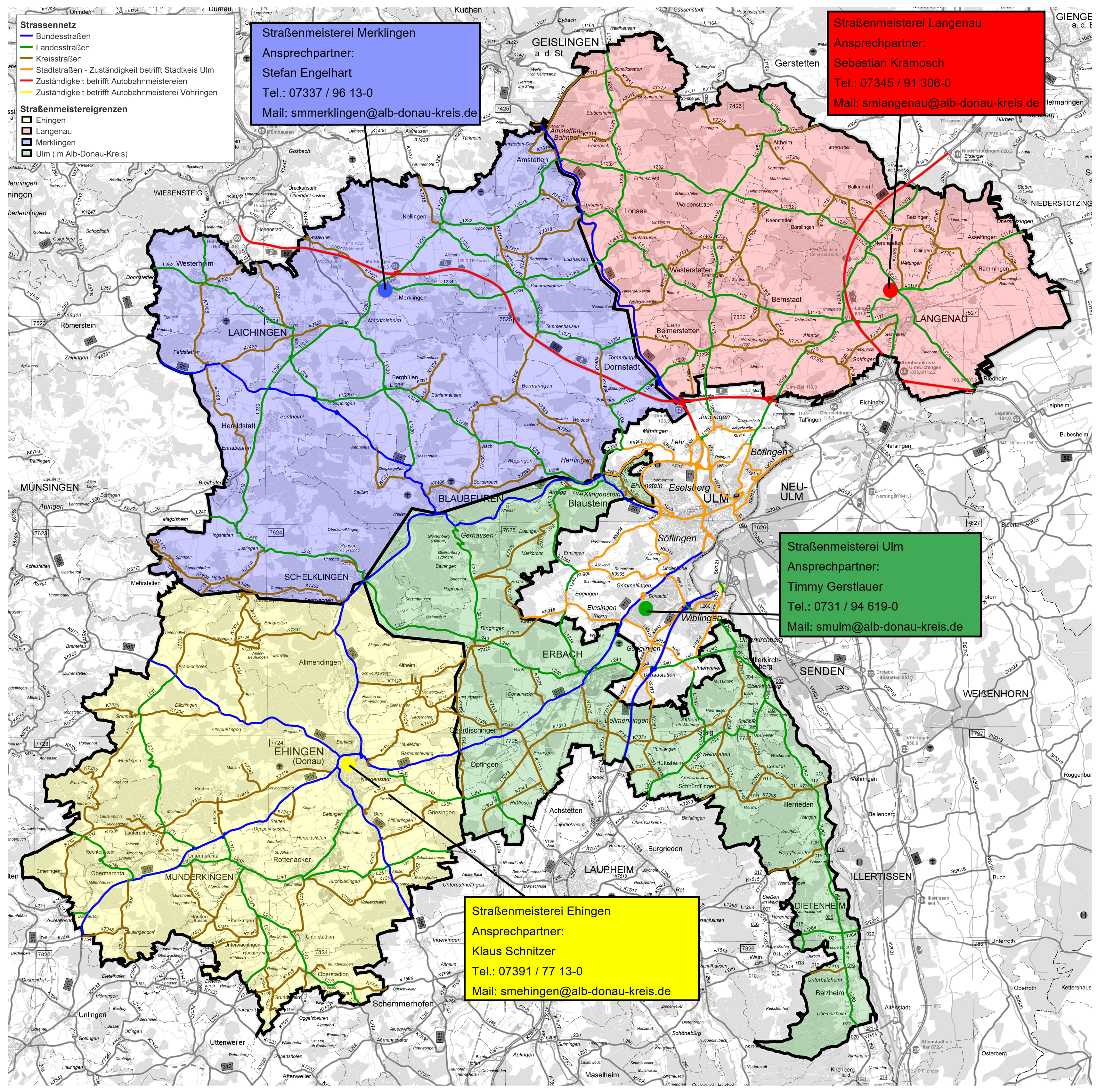 Die Zuständigkeitsbezirke unserer vier Straßenmeistereien mit Ansprechpartner sehen Sie auf den nachfolgenden Kartenausschnitt. Zur Vergrößerung klicken Sie diesen bitte an: