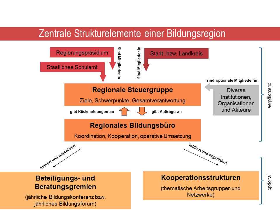 Die Regionale Steuergruppe ist das Entscheidungsgremium der Bildungsregion. In gemeinsamer Verantwortung entwickeln die Mitglieder Leitziele und setzen Handlungsschwerpunkte. Der Regionalen Steuergruppe obliegt die Maßnahmenplanung und die Ressourcensteuerung.