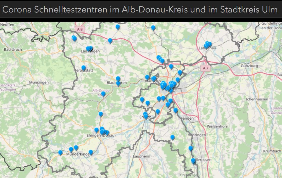 Die nachstehende Karte zeigt die dem Gesundheitsamt bekannten Teststationen im Alb-Donau-Kreis und im Stadtkreis Ulm.