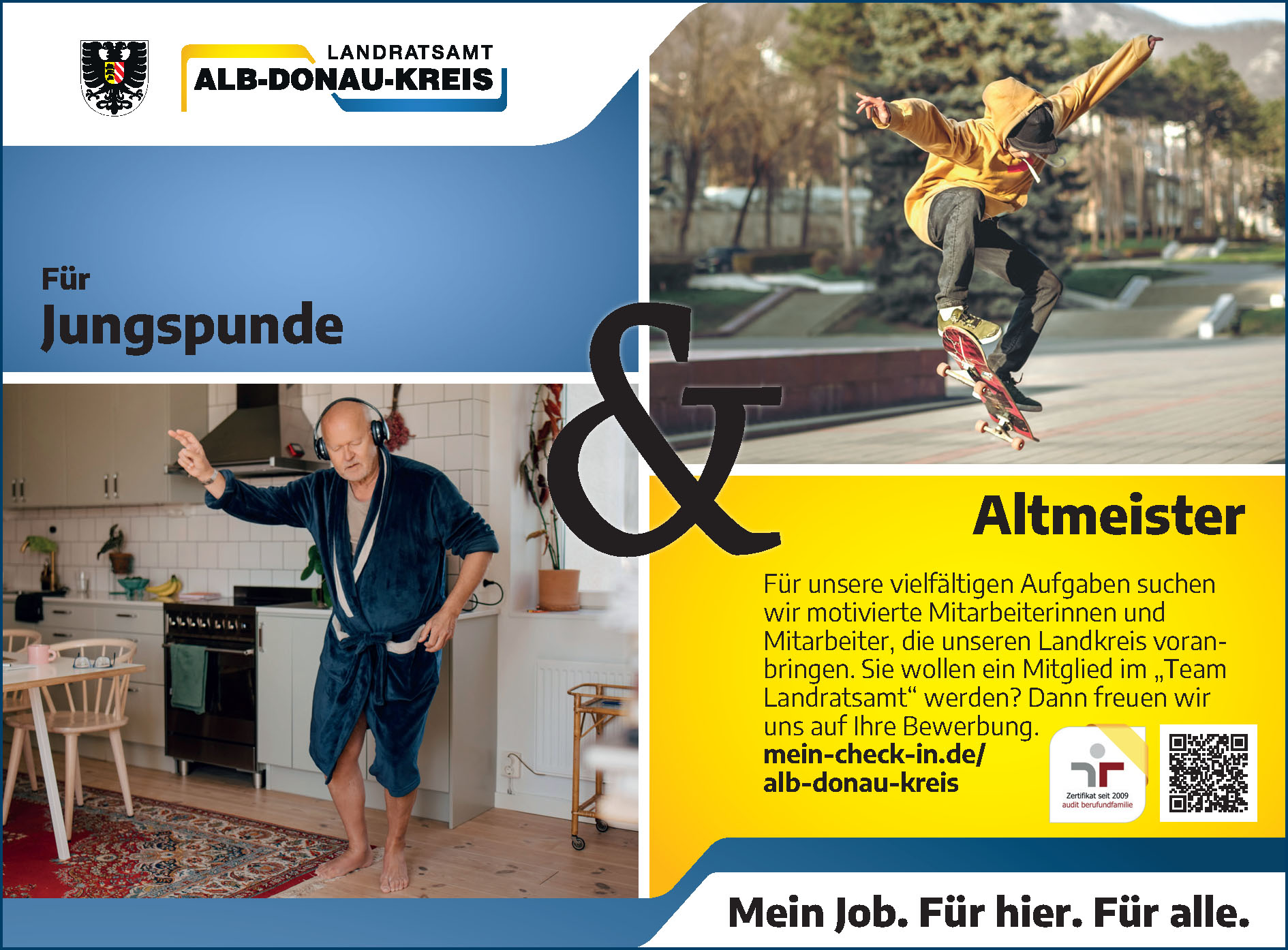Berufliche Ziele und Verpflichtungen auf der einen Seite, das Familienleben auf der anderen: Im Landratsamt Alb-Donau-Kreis unterstützen wir unsere Mitarbeiterinnen und Mitarbeiter bestmöglich bei dieser Balance. Als Arbeitgeber haben wir bereits zum fünften Mal erfolgreich am audit berufundfamilie teilgenommen, einer Initiative der gemeinnützigen Hertie-Stiftung. Dabei sind wir für unsere familienbewusste Personalpolitik ausgezeichnet worden.