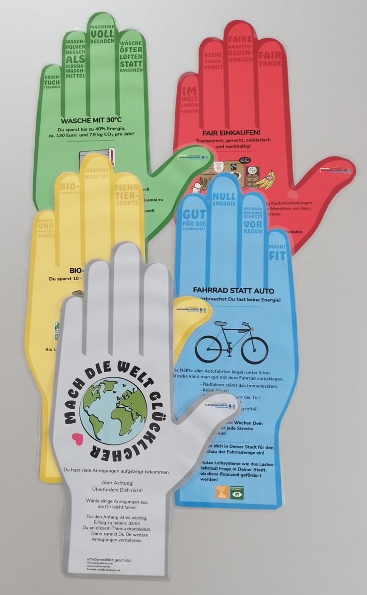 Als ergänzendes Bildungsmaterial zum Ökologischen Fußabdruck kann der Ökologische Handabdruck kostenfrei über das Regionale Bildungsbüro ausgeliehen werden.