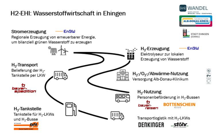 Verschiedene Akteure haben sich zusammengefunden, um das Projekt auf Basis einer Machbarkeitsstudie, die vom Land Baden-Württemberg gefördert wird, praktisch umzusetzen. Dazu zählen neben dem Energieerzeuger ENBW die Speditionen Stöhr und Denkinger, die Busunternehmen Bayer und Bottenschein, die Daniel Späth GmbH als Betreiber der Wasserstoff-Tankstelle und die ADK GmbH mit dem Alb-Donau-Klinikum Ehingen.
