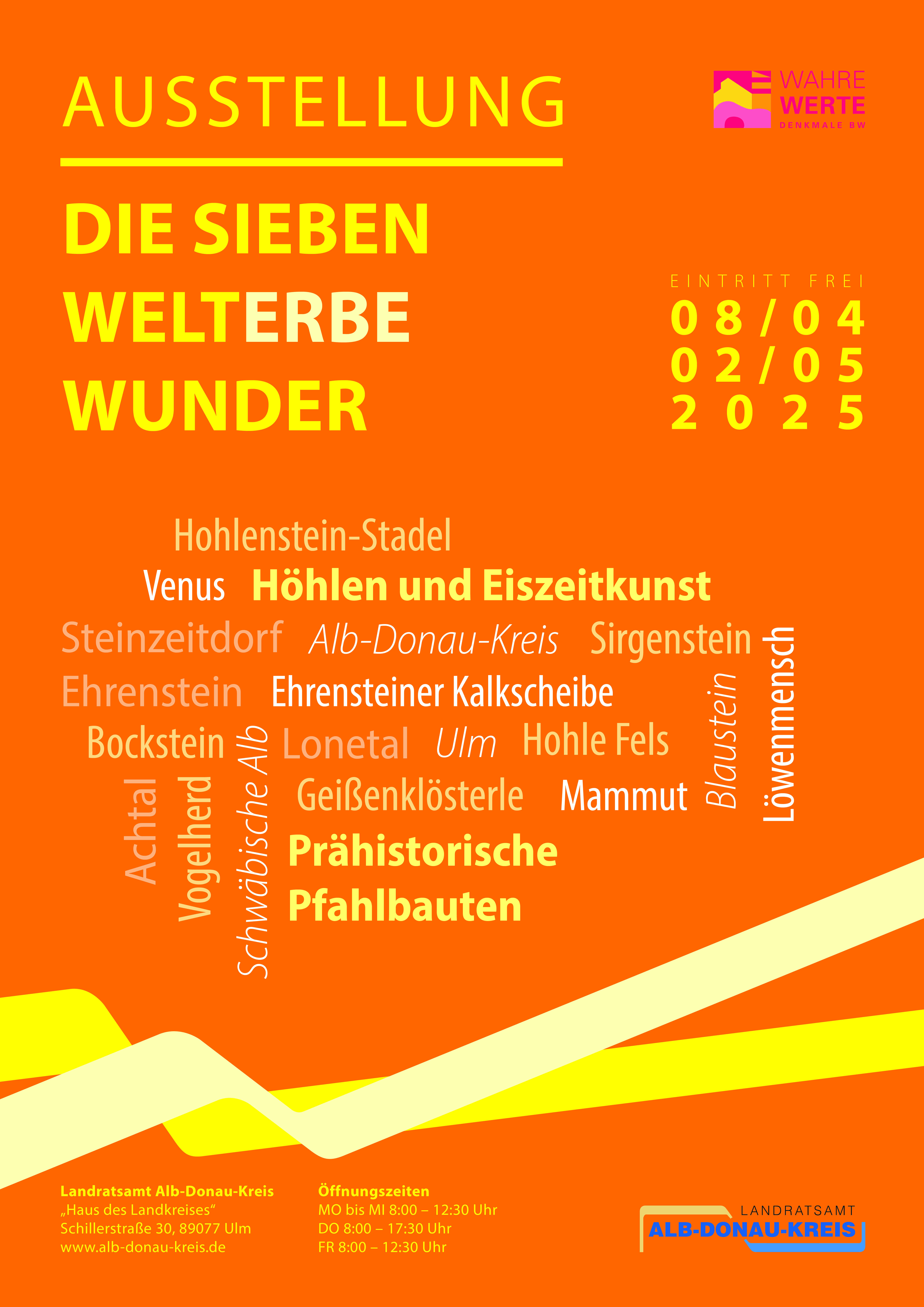 Das Landratsamt Alb-Donau-Kreis zeigt vom 8. April bis 2. Mai 2025 die Wanderausstellung „Die sieben Welterbewunder Baden-Württemberg“ im Haus des Landkreises in Ulm. Die Ausstellung des Ministeriums für Landesentwicklung und Wohnen Baden-Württemberg stellt die sieben UNESCO-Welterbestätten des Landes vor und macht deren kulturgeschichtliche Bedeutung sichtbar – von der Eiszeitkunst der Schwäbischen Alb bis zur modernen Architektur von Le Corbusier.