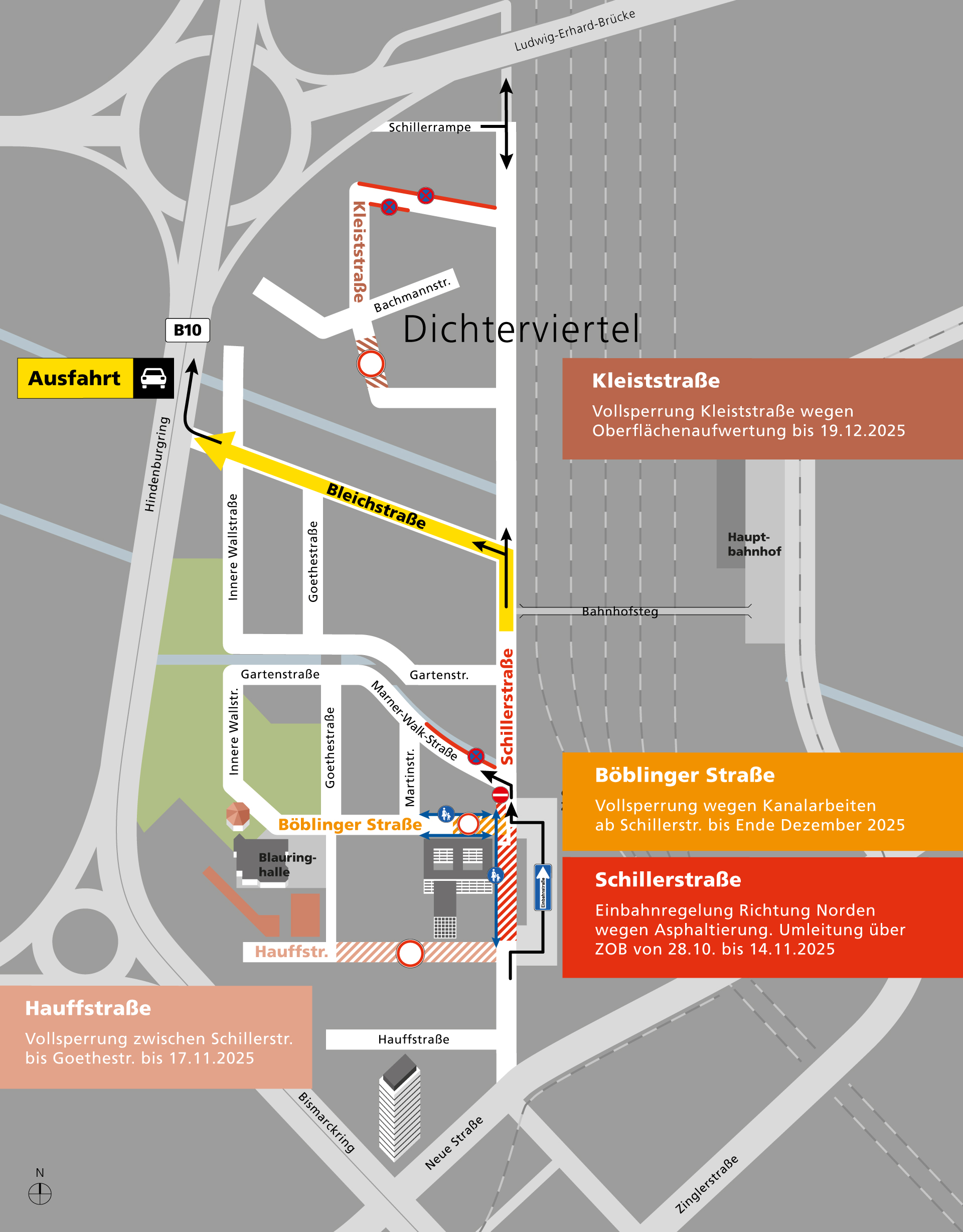 Die Schillerstraße wird ab Dienstag, den 28. Oktober 2025, bis voraussichtlich Mitte November zur Einbahnstraße in Fahrtrichtung Norden bzw. Richtung Ludwig-Erhard-Brücke. Damit ist das Landratsamt in dieser Zeit mit dem Auto nur von Süden erreichbar.
